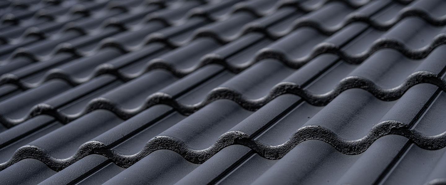 Tak med betongpannor som målats i färgen antracit (NCS 8005-R80B)